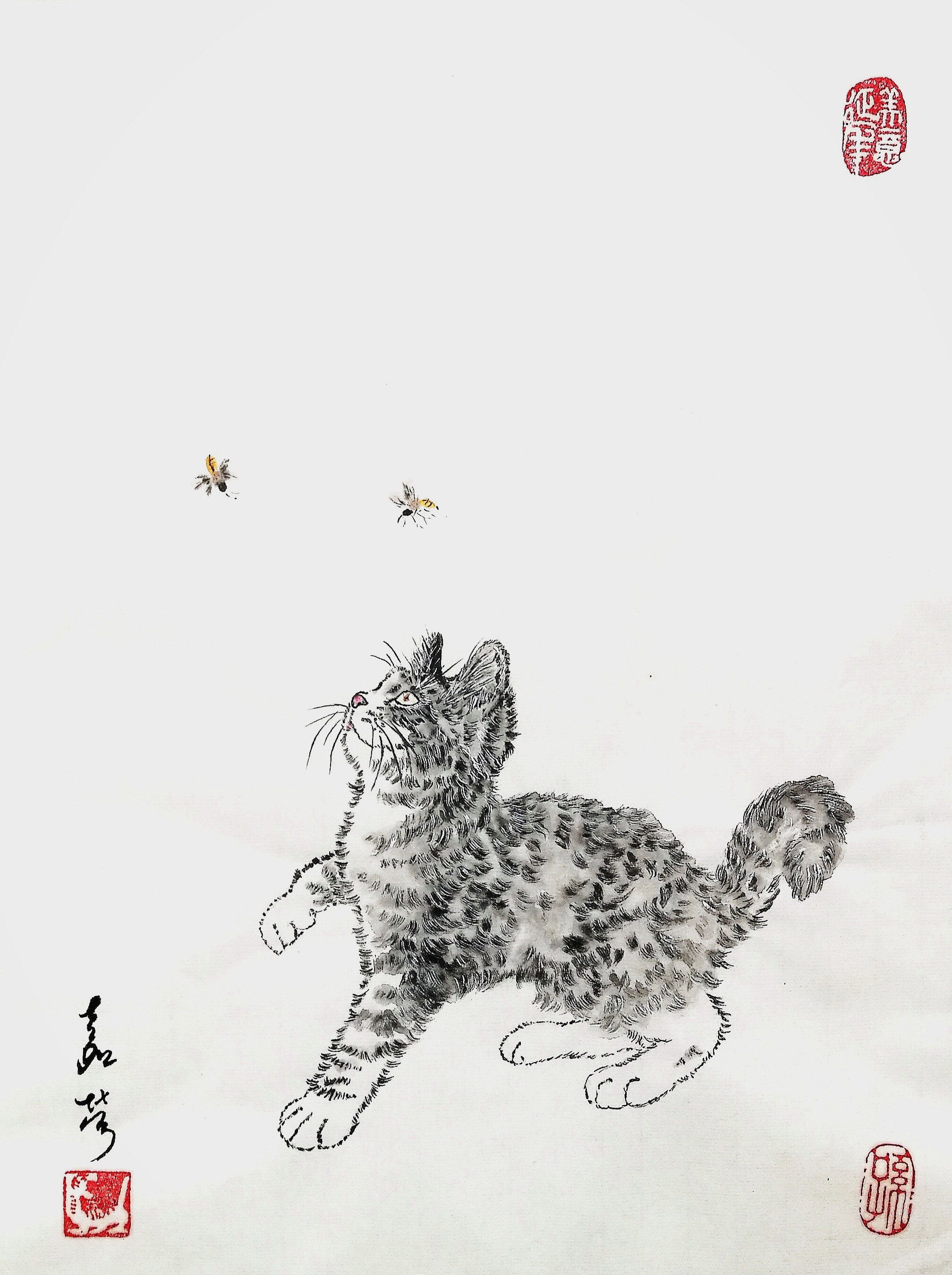 Chinese Traditional Water-Ink Painting - Cat and Bee