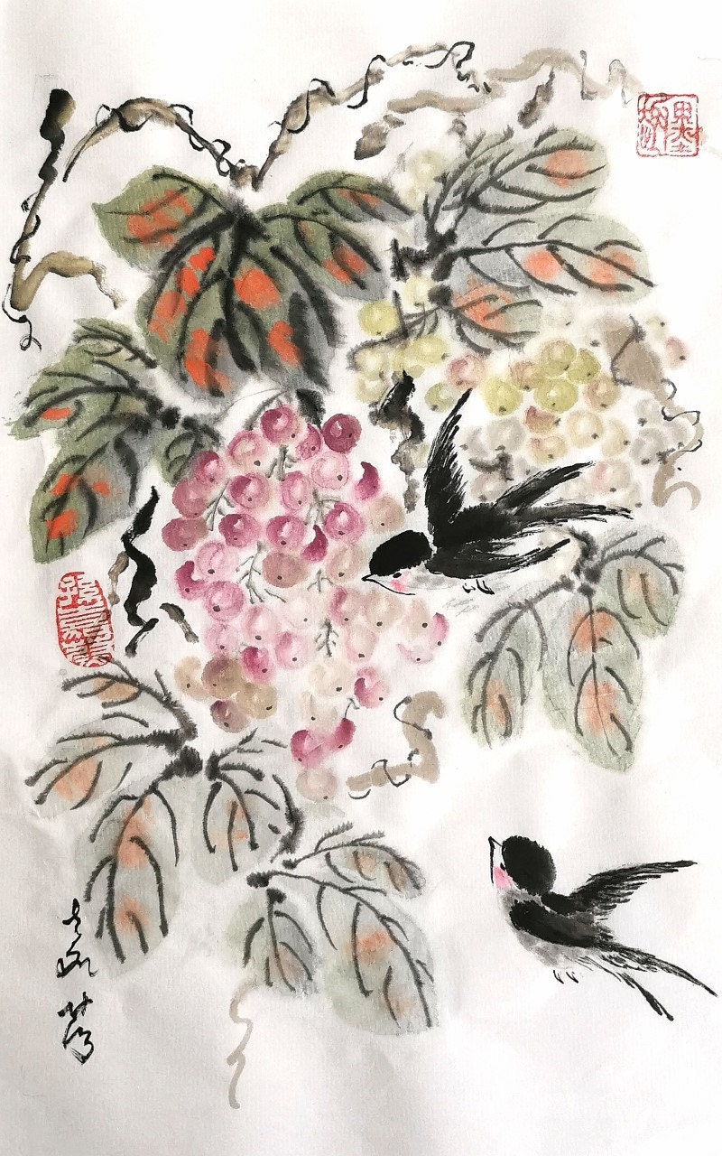 Chinese Traditional Water-Ink Painting - Swallow and Grape Tree