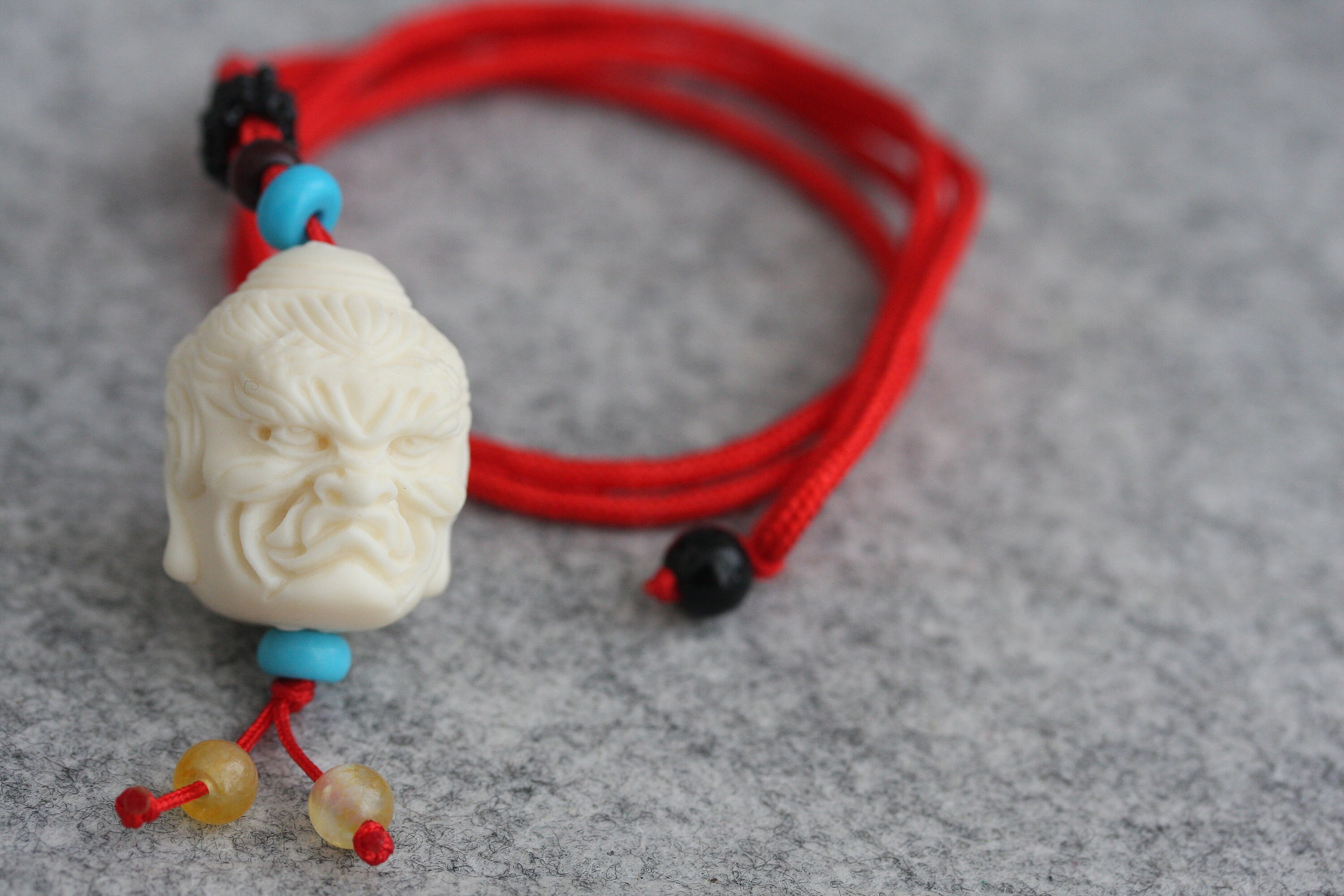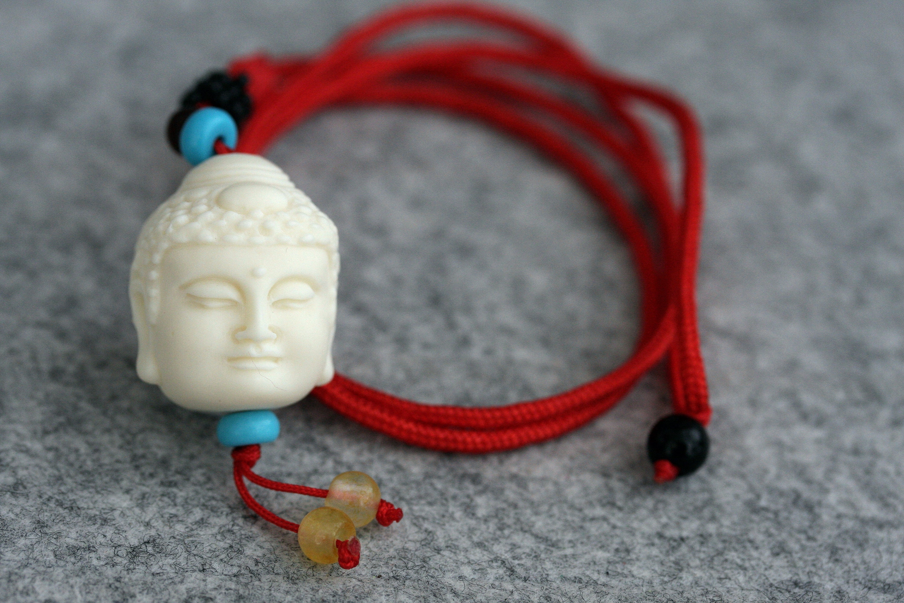 This Buddha Double face necklace was designed and handmade by me. I used 1 Ivory nut bead, 2 turquoise bead; 2 yellow jades beads and a 60cm red rope to make a lucky necklace.