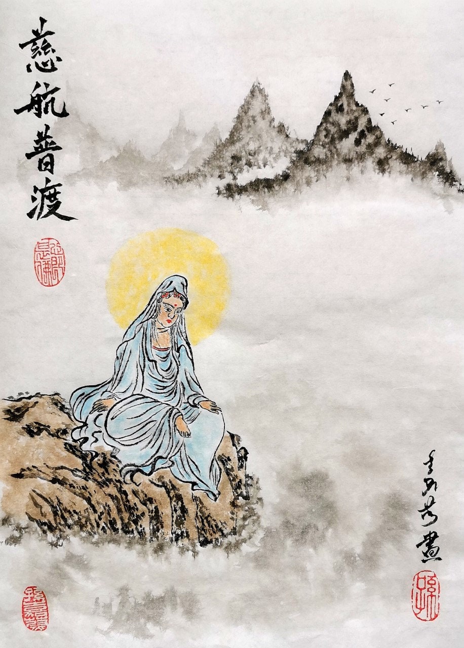 In Chinese art, Guanyin is often portrayed in serene meditation or standing gracefully by the sea, symbolizing purity, wisdom, and peace.