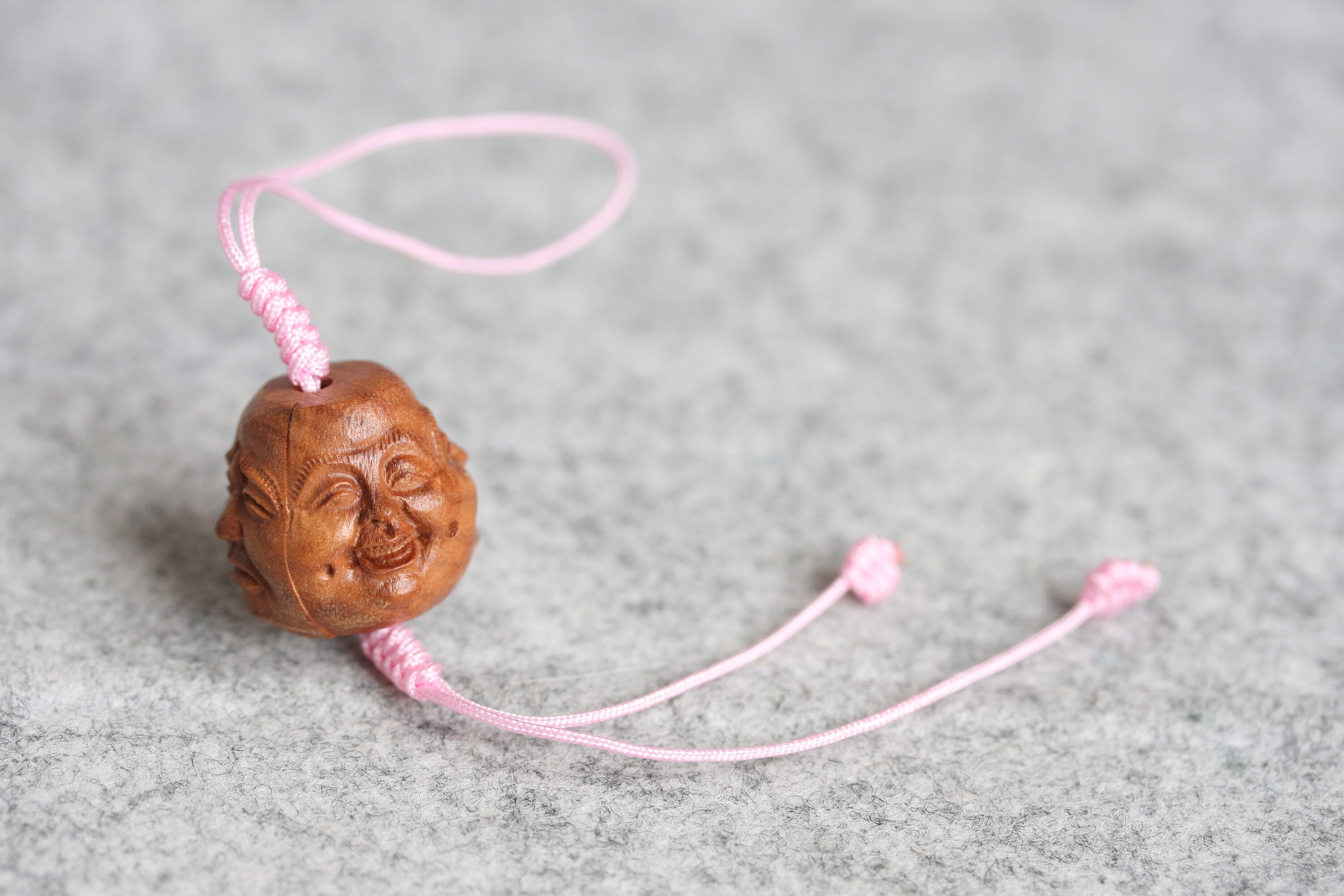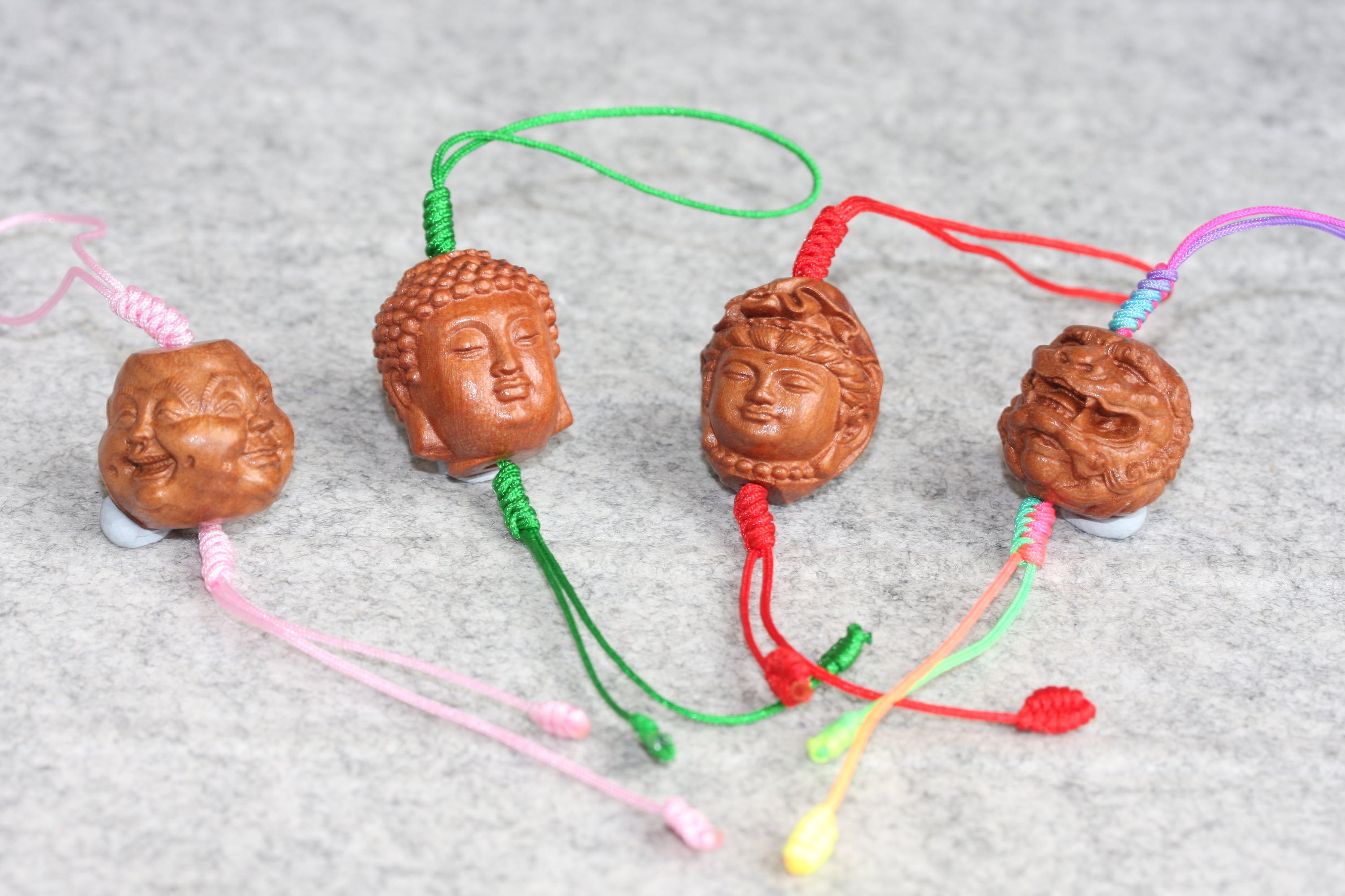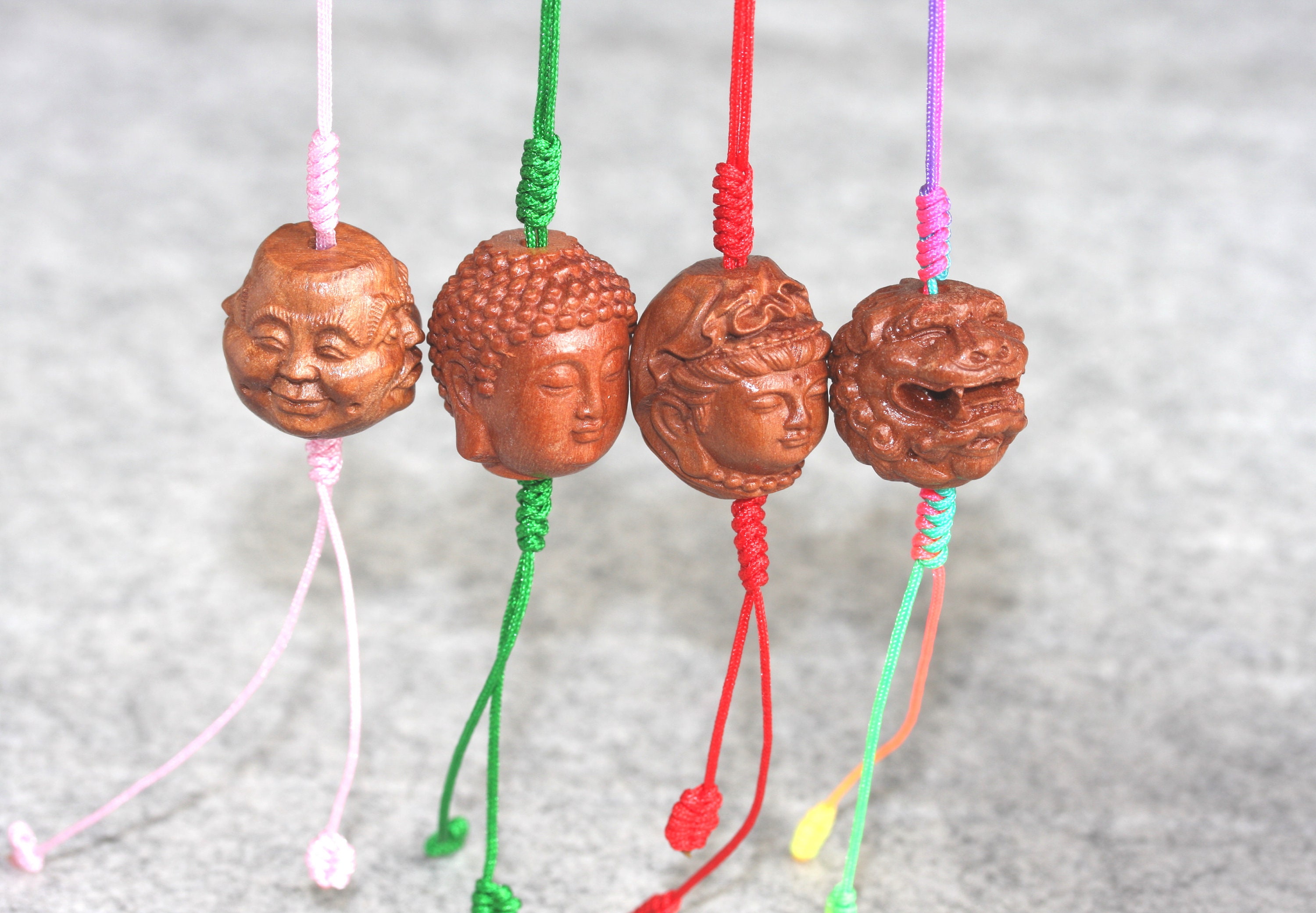 Original design Handmade braided mobile phone charm / keyring , Used hand carved Peach wood Buddhism beads (Four face Buddha, Guan Yin and Rulai Buddha).