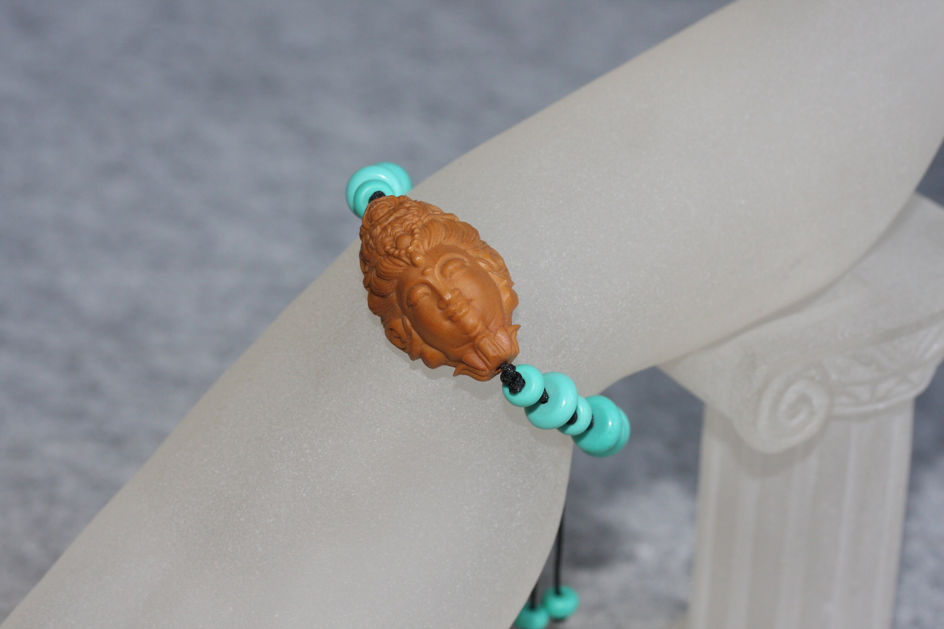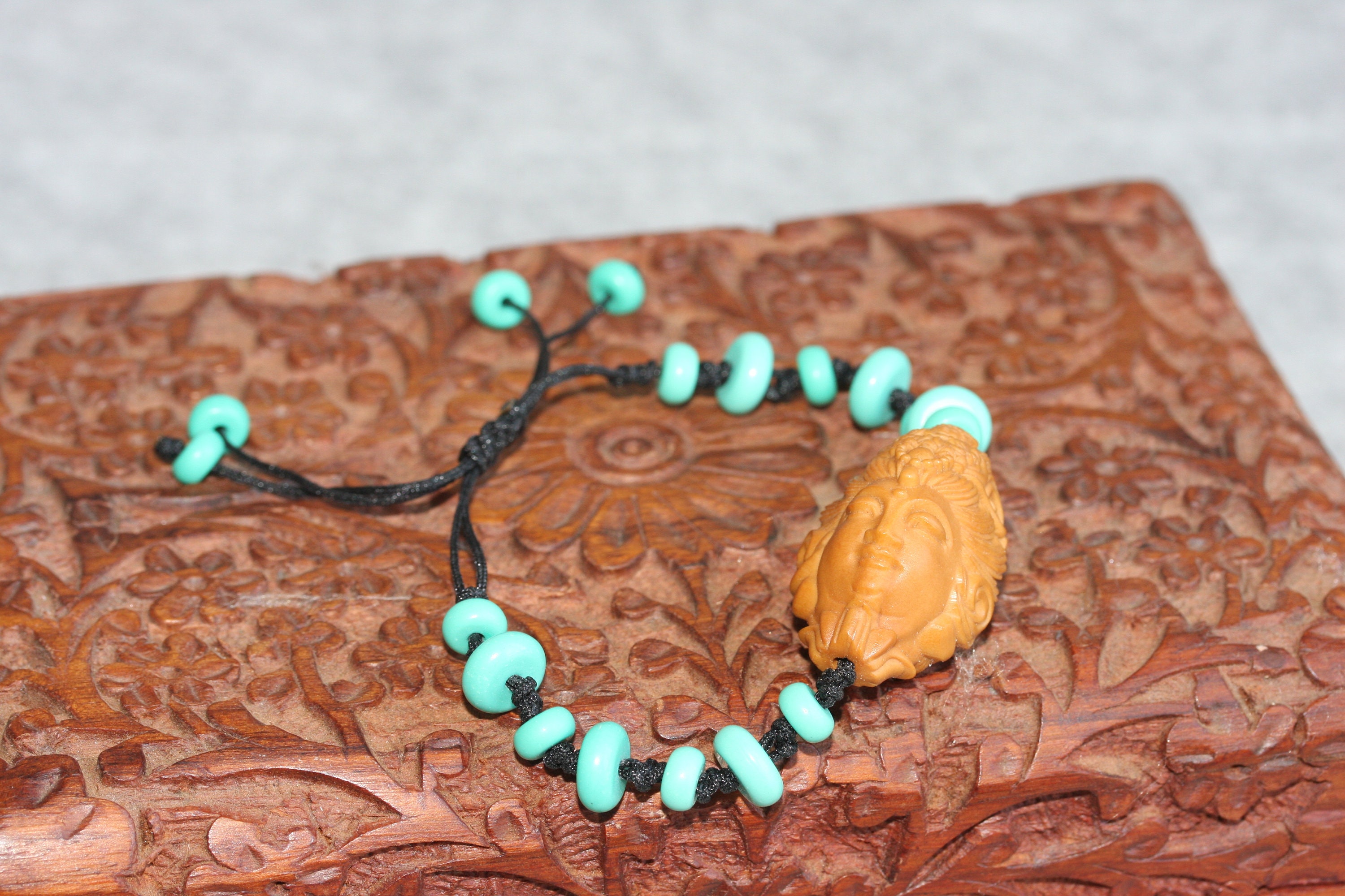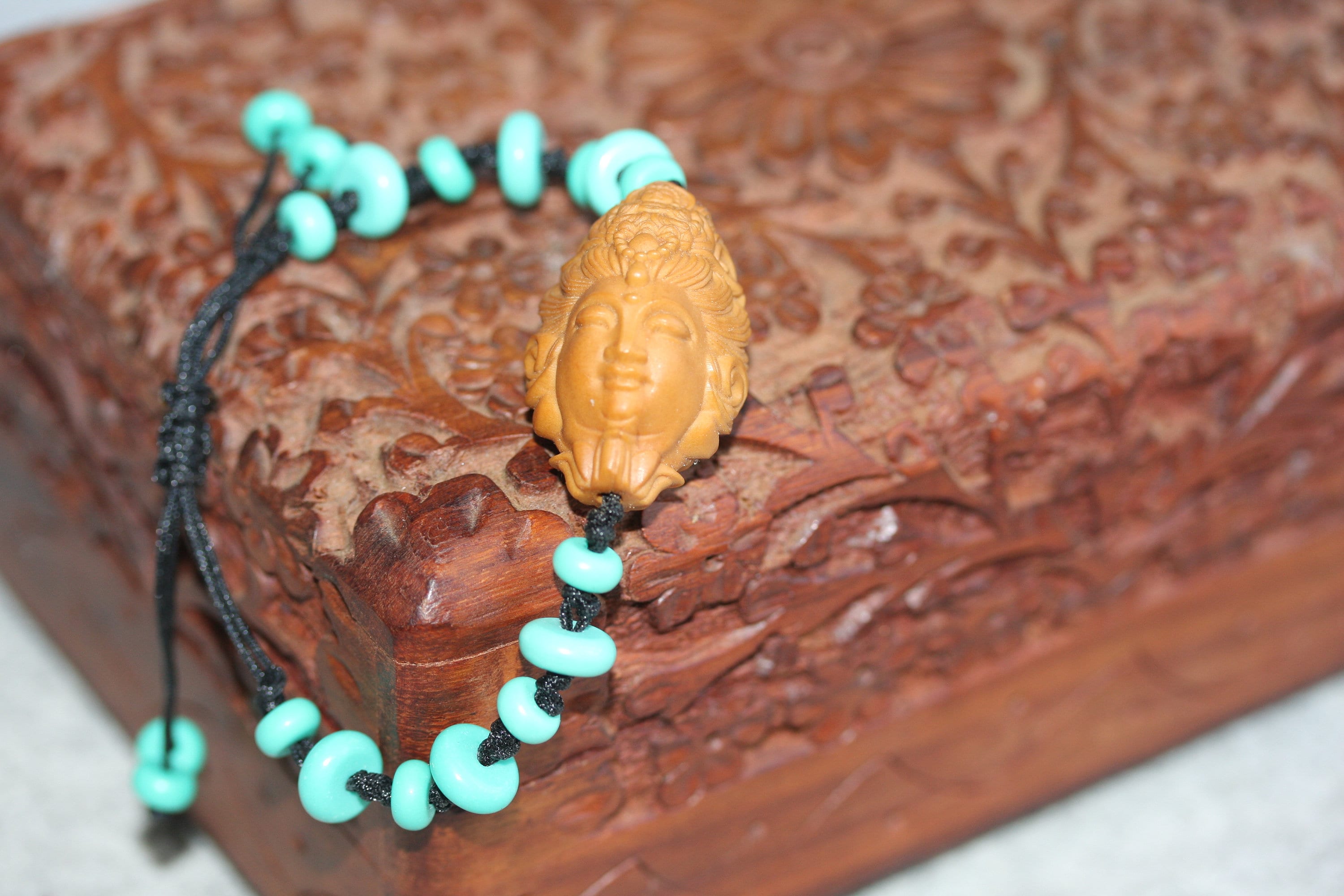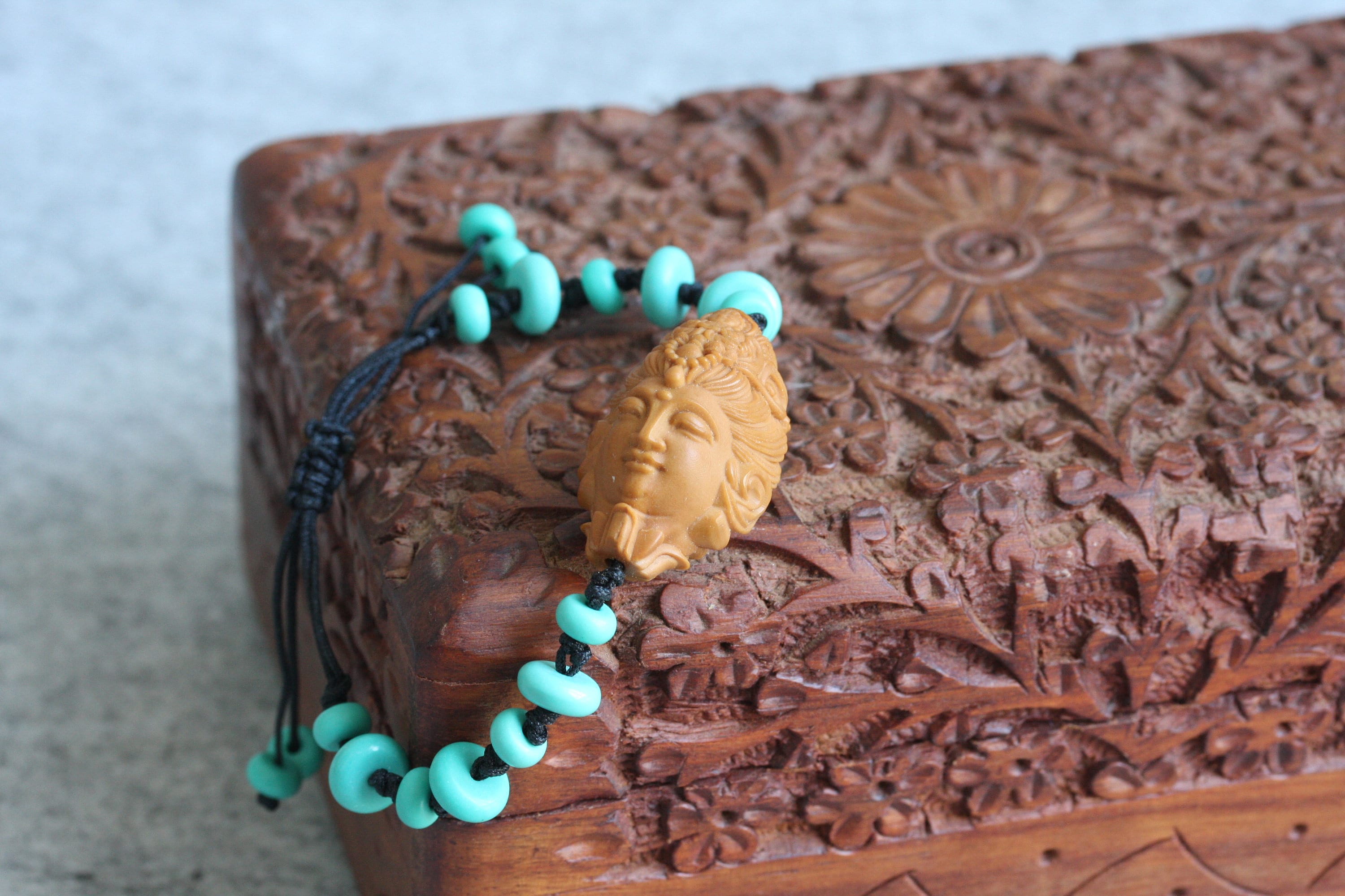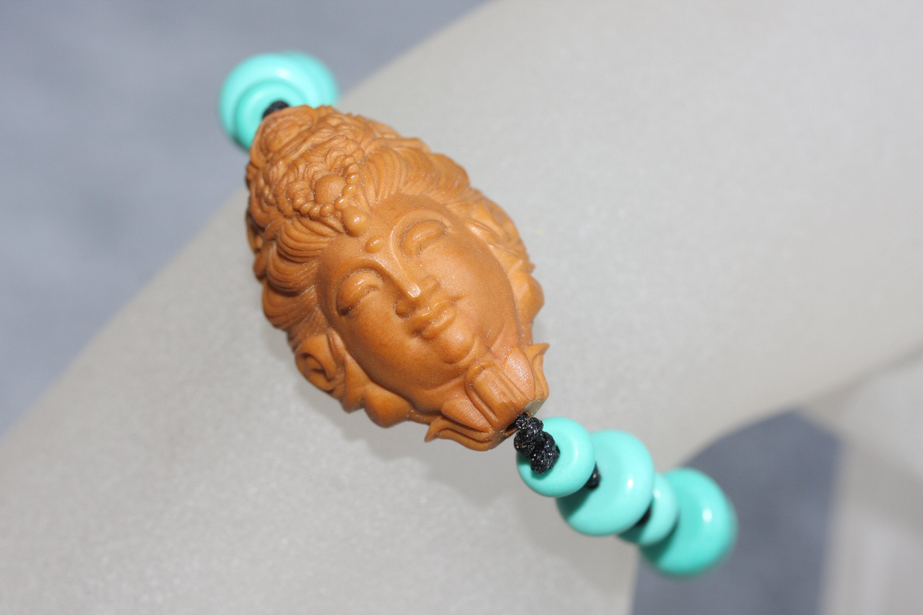 This Hand Carved Olive Pit Bead GuanYin Face Bead & Turquoise Braided Bracelet /