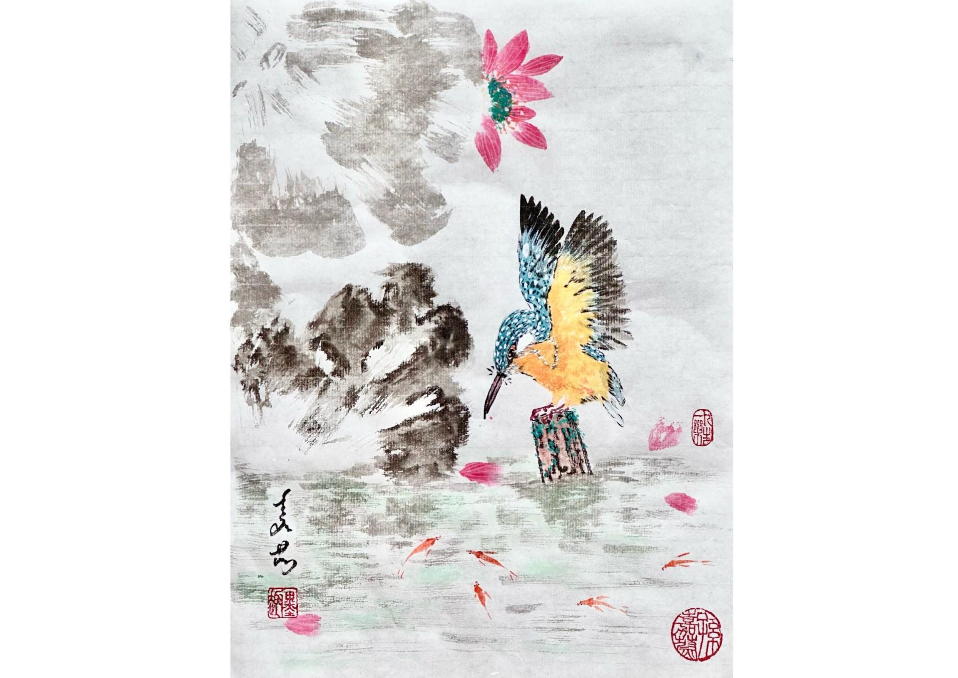Original Chinese brush painting, Sumi-e traditional art, "Kingfisher, Lotus & Fish" #3, Size "12 x 16" / 30 x 40cm. Customer Order Welcome